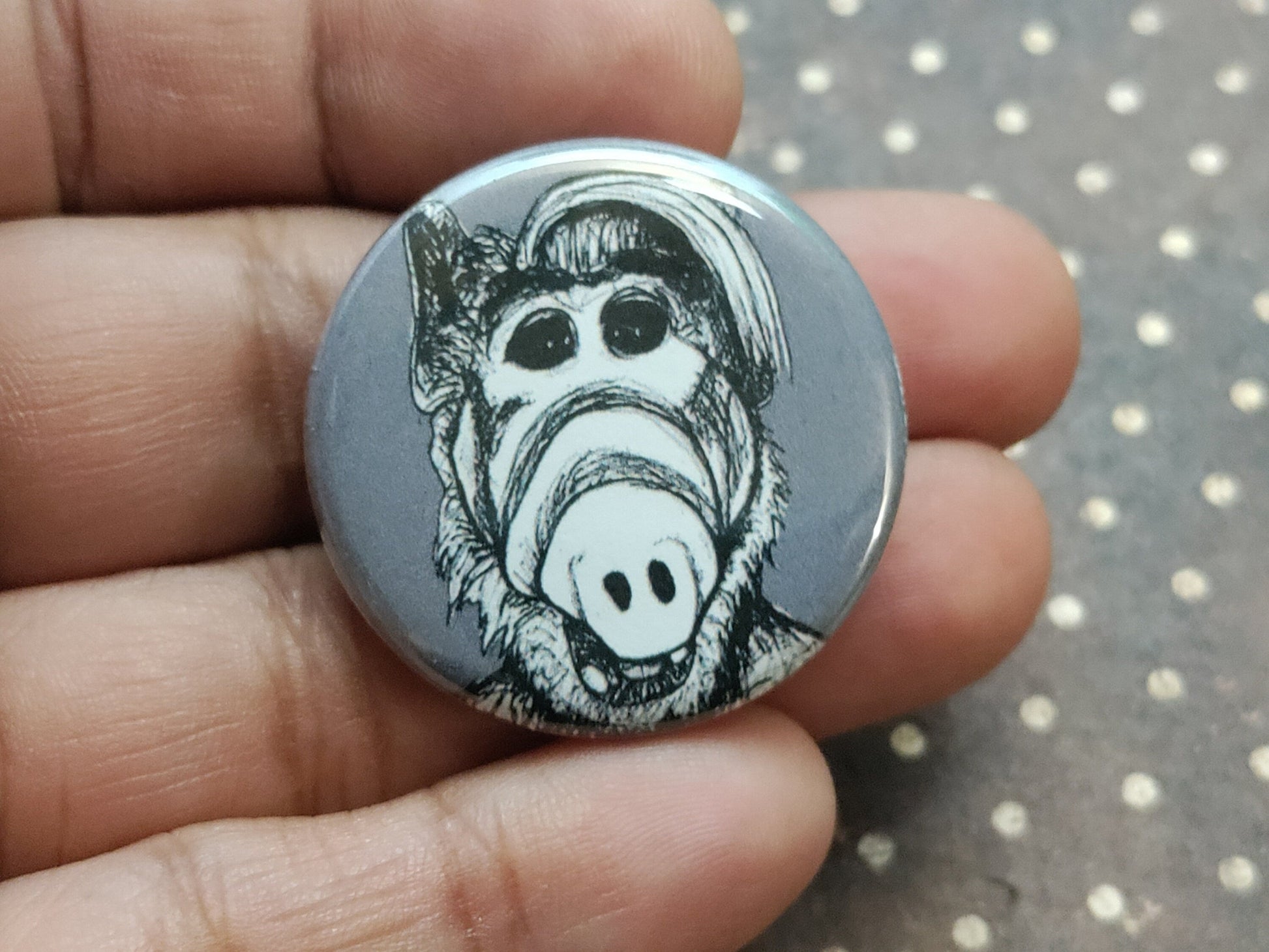Please note: Any spots visible in the product images are camera reflections, ensuring that your pinback button arrives in pristine condition. Join the ALF fandom and embrace the nostalgia with this captivating ALF Pin.