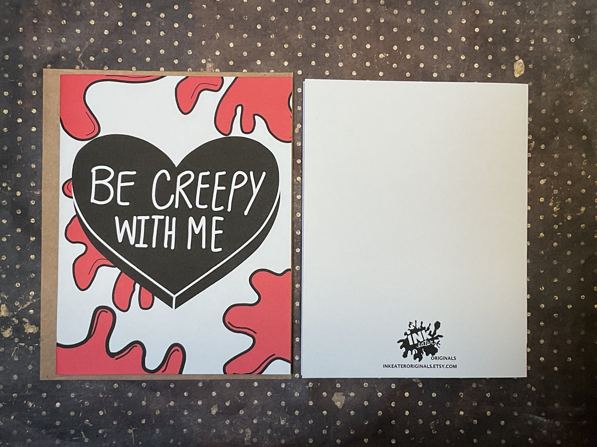 Celebrate your love with a touch of terror. This Be Creepy With Me card is perfect for horror fans who want to keep things spooky and sweet. Featuring hand-drawn portraits and eerie candy hearts, this unique anniversary card is designed for those who appreciate the darker side of love.