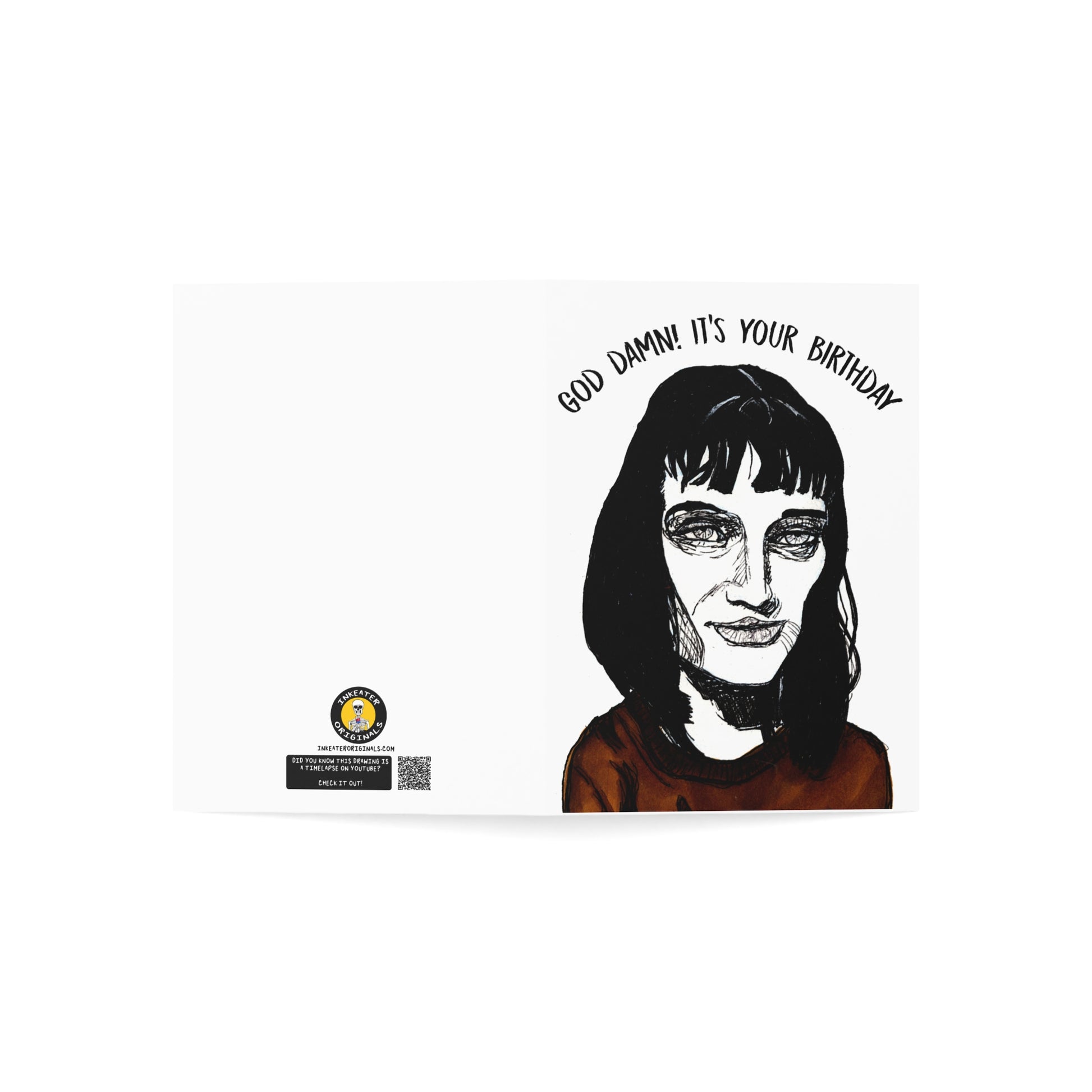 Introducing our "God Damn! It's your birthday!" Pulp Fiction birthday card, featuring a hand-drawn portrait of Mia Wallace. It's the perfect gift for those seeking funny and offbeat birthday presents. Whether it's for your odd and offbeat friend, family member, or anyone with a quirky sense of humor, this card will bring laughter and joy to their special day. Write a personalized message inside and watch their face light up with delight.