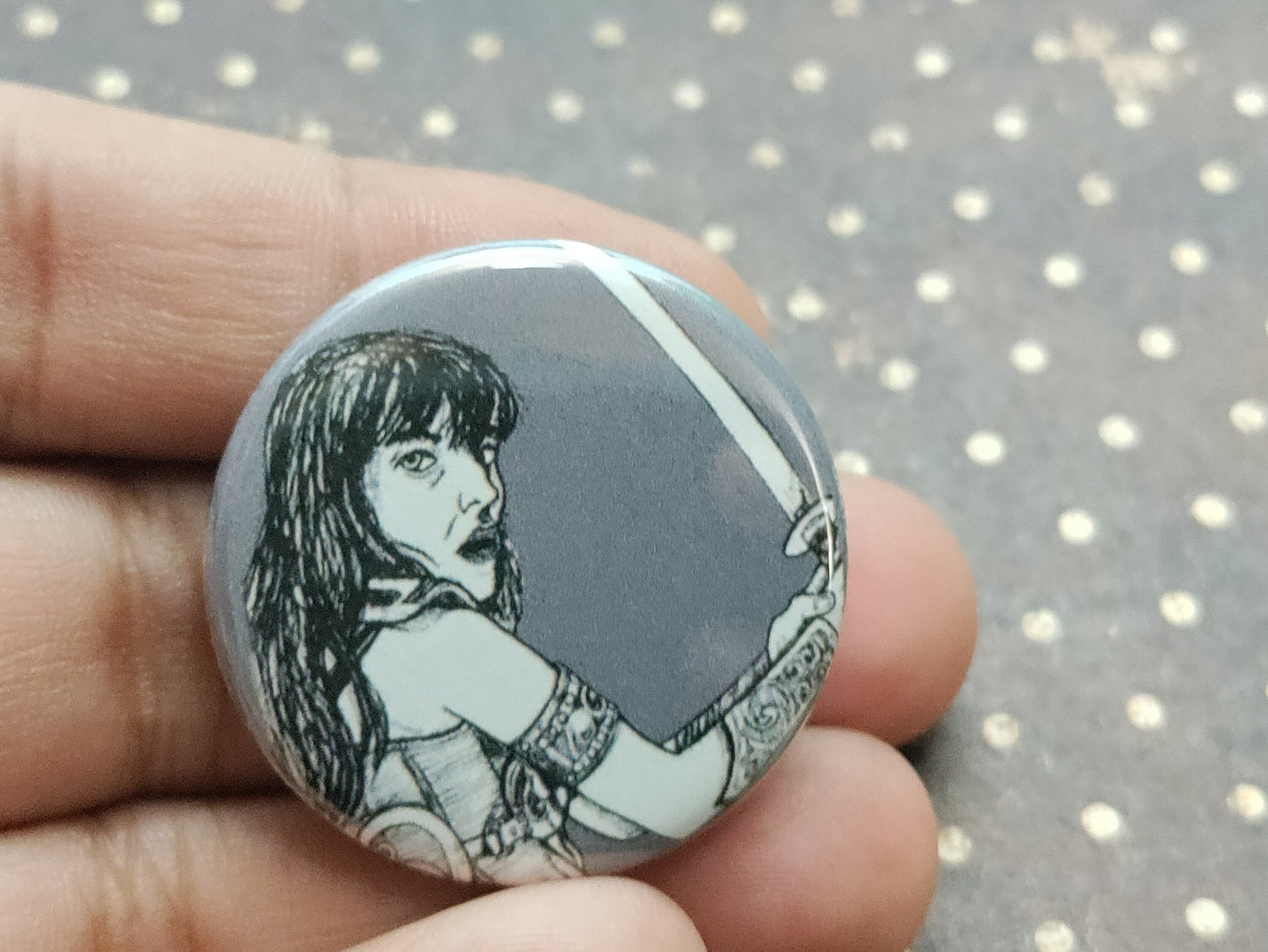 This pinback button is intended for fans of the Xena TV show, collectors of pinback buttons, and anyone who wants to showcase their love for the legendary warrior princess. Simply attach it to your favorite accessories and let your inner Xena shine!