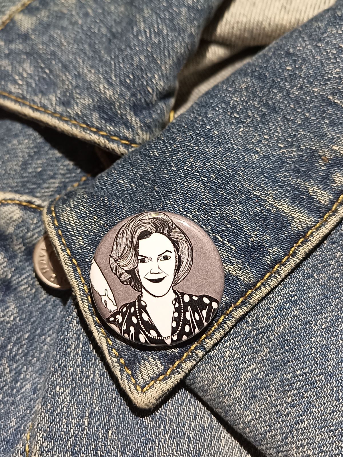 Hand-cut and laser-printed by Inkeater, it captures the killer charm of everyone’s favorite polite psychopath. Whether you love true crime satire or just appreciate moms who kill for good manners, this button belongs in your collection.