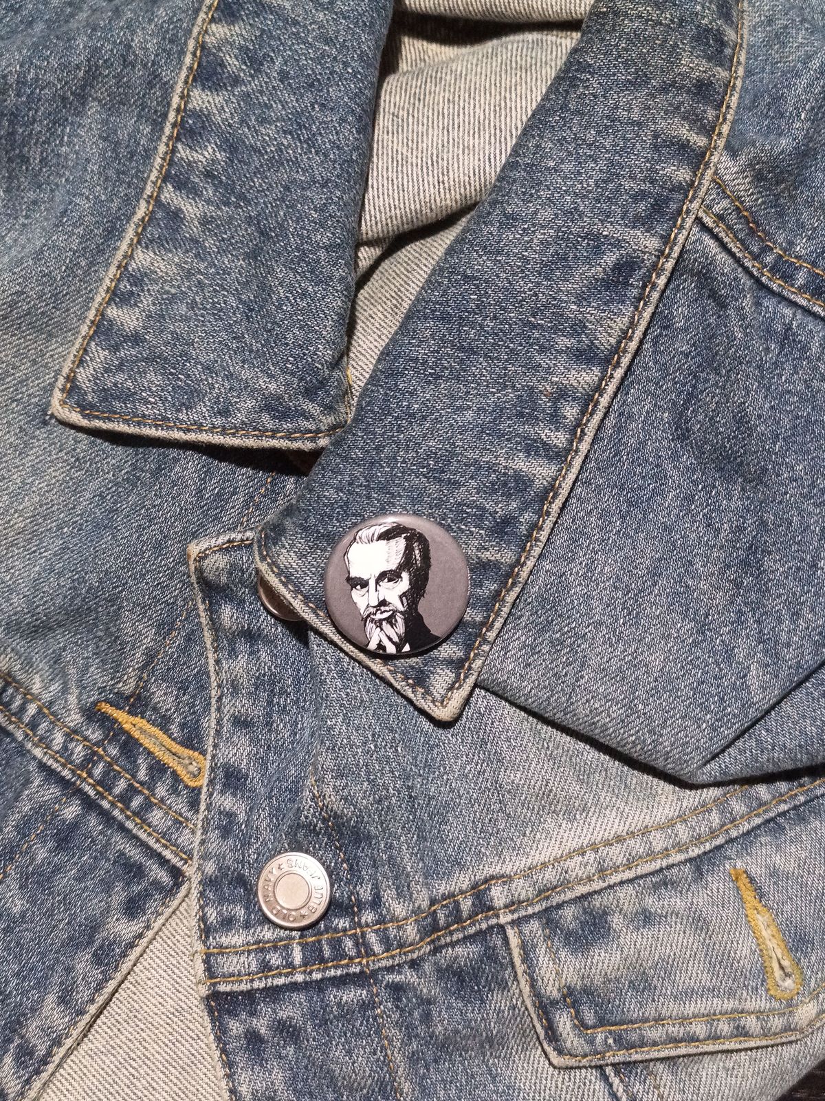 Unleash the eerie charm with the Sir Christopher Lee Pinback Button. Hand-cut with spooky love, it's a perfect gift for horror enthusiasts.